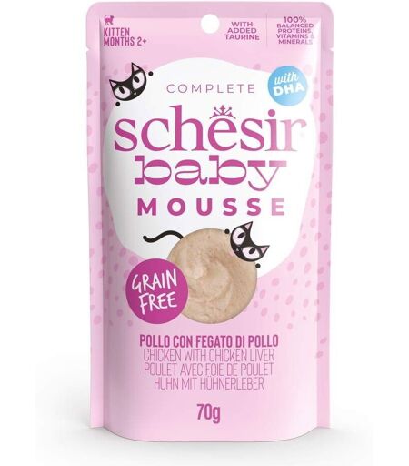 Schesir Baby Mousse Kylling Schesir Baby Mousse Kylling er en balansert mousse for kattunger fra avvenning til ett års alder. Den myke moussen er enkel å spise og letter overgangen fra morsmelk til fast føde. I tillegg er den kornfri og proteinrik samt beriket med taurin og DHA-fettsyrer som støtter hjernens utvikling. Taurin er nødvendig for katter, spesielt kattunger, da den er viktig for utviklingen av hjertet og hjernen. Forpakningsstørrelse 70 g. Balansert, kornfri mousse for kattunger. Letter overgangen fra morsmelk til fast føde . Rik på kjøtt og beriket med taurin og DHA-fettsyrer for sunn vekst og utvikling. Støtter hjernens utvikling og fremmer en sunn hjertefunksjon. Forpakningsstørrelse: 70 g. ...