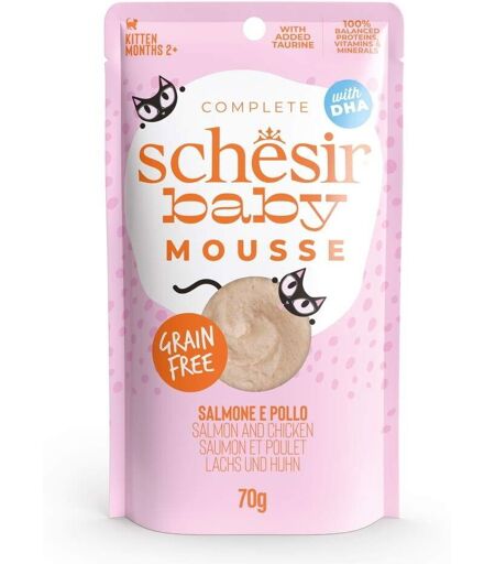 Schesir Baby Mousse Salmon – Myk og god kattungemat! Dette er et nydelig våtfôr spesielt utformet for kattungens første leveår. Fôret har en myk og herlig moussekonsistens som letter overgangen fra morsmelk til fast føde. Fôret er kornfritt og inneholder næringsrik laks med omega-3-fettsyrer samt proteinrik kylling. Det er beriket med taurin for å støtte en sunn hjertefunksjon og synsutvikling, samt DHA-fettsyrer som fremmer utvikling av hjerne og sunn vekst. Kornfritt våtfôr Støtter kattungens utvikling Passer for kattunger mellom 2 måneder og 1 år Forpakningsstørrelse: 70 g ...