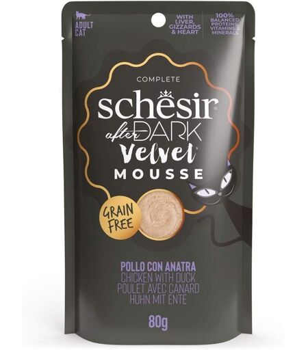 Schesir Cat Adult After Dark Velvet Mousse Kylling & And 80 g Schesir After Dark Velvet Mousse Kylling & And er en kjøttrik og kornfri mousse for voksne katter, laget av kylling, innvoller og and. Dette minimalt bearbeidede Schesir-våtfôret er et komplett fôr som inneholder alle de viktige næringsstoffene som katten din trenger. Nøkkelfunksjoner: Balanse: Et balansert, gluten- og kornfritt våtfôr for voksne katter. Støtter helsen: Kornfritt fôr som fremmer kattens velvære. Naturlig sammensetning: Inneholder kjøtt, lever, hjerte og muskelmage, noe som etterligner kattens naturlige bytte. Økt smaklighet: Innvollene forbedrer smaken og tilfører viktige vitaminer, mineraler og aminosyrer. Høyt proteininnhold: Rik på animalsk protein fra dampkok kylling og storfekjøtt. Minimal bearbeiding: Minimal bearbeiding for å opprettholde næringsstoffene. Støtter urinveiene: Våtfôret bidrar med ekstra væske som fremmer urinveiene. Porsjonsstørrelse: 80 g forpakning. ...
