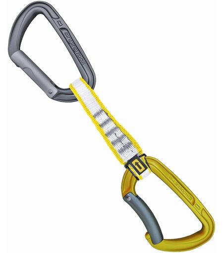 Sportsklatresett med to klassiske karabinere. Kileformet 25mm slynge som er god å "grabbe". Karabinbruddstyrke: åpen: 11kN langs: 26kN tvers: 8kN Karabinåpning: 21 Slyngebruddstyrke: 22kN Slyngelengde: 11cm Vekt: 99 g EN 566 EN 12275 ...