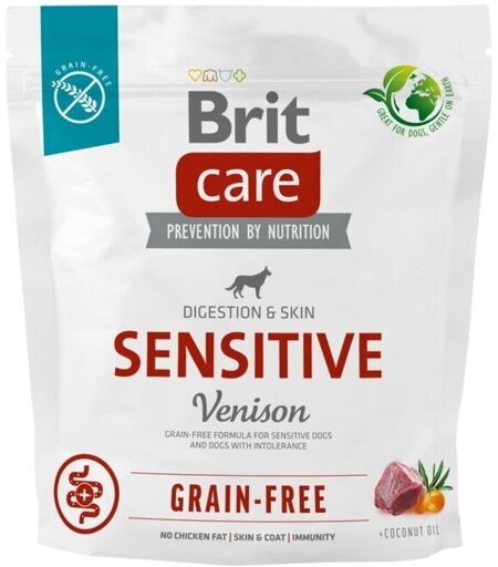Brit Care Dog, Grain-free, Sensitive Kornfritt tørrfôr laget av viltkjøtt. For sensitive hundemager Brit Care Dog, Grain-free, Sensitive – er et spesialutviklet fôr for hunder med sensitiv mage og matallergi. Protein fra viltkjøtt er magert og lett fordøyelig for hunden, og reduserer risikoen for å trigge fôrallergi. Brit Care Dog, Grain-free, Sensitive inneholder alle viktige næringsstoffer hunden trenger for en sunn og aktiv livsstil. Hovedingrediensen er proteinrikt viltkjøtt. I tillegg har man tilsatt helsebringende omega 3. Visste du at omega 3 inneholder fettsyrer som er viktige for reparasjon og fornyelse av hundens celler, hud og pels? Omega 3 er dessuten bra mot flass i pelsen og tørre tråputer. ?Gjenlukkbar fôrsekk i tre forskjellige størrelser – praktisk! Noen er superingrediensene i dette fôret er: passer for alle hunderaser uten kyllingfett – tørrfôr basert på viltkjøtt for å unngå eventuelle allergiske reaksjoner på kyllingprotein. hud og pels – store mengder omega 3 for å styrke huden og gi pelsen ekstra glans. immunforsvar – probiotika og antioksidanter styrker immunforsvaret og hjelper fordøyelsen. ...