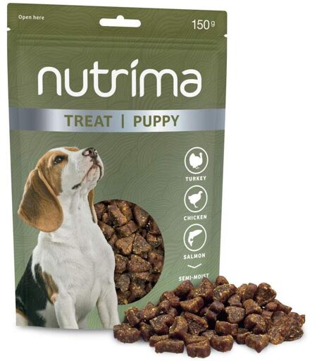 Nutrima Hundegodteri Puppy 150 g Et utmerket valg av treningsgodteri for valper! Dette kornfrie godteriet er spesielt utformet for valpens behov, men passer også fint for voksne hunder! Disse godbitene inneholder en fristende blanding av kalkun, kylling og laks, som vi tror blir en utmerket belønning for valpen din. Godteriet består av halvmyke biter og gir en herlig tygge- og smaksopplevelse! Natrima Hundegodteri Puppy inneholder laks som er rik på omega-3, som er viktig for utviklingen av hjernen og synet, samt prebiotika for en sunn mage og taurin for et sterkt hjerte. Et velsmakende valpegodteri som er kornfritt og fullt av masse god smak! Valpegodteri med kylling, laks og kalkun Halvmyke biter Med omega-3 og prebiotika Kornfritt ...