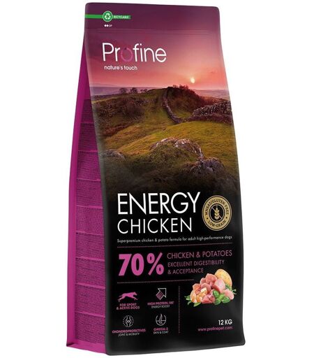 Profine Energy Chicken Profine Energy Chicken & Potatoes er et komplett fôr spesielt utformet for voksne hunder med høyt energibehov. Fôret inneholder kylling og en høyere andel energi enn normalt voksenfôr. Det er beriket med viktige næringsstoffer som støtter hud, pels, leddhelse og immunforsvar, noe som gjør det til et perfekt valg for aktive og arbeidende hunder. Høyt protein- og fettinnhold for økt energi. Støtter ledd og bevegelighet med naturlige chondroprotectives og mineraler. Fremmer tarmhelse og immunitet med prebiotika og sjøalger. Forbedrer hud og pels med reker og lakseolje. Egner seg for voksne hunder med høyt energibehov. ...