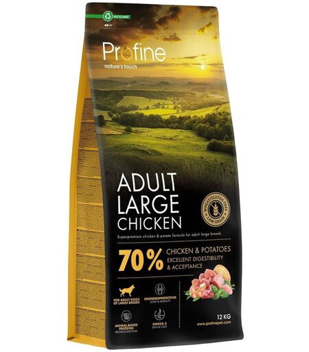 Profine Adult Large Chicken Dette er et komplett fôr spesielt utformet for voksne hunder av store raser. Fôret fremmer god allmennhelse og velvære hos hunden, med en kombinasjon av høy andel kylling og potet samt tilsatte næringsstoffer. Fôret har en høy fordøyelighet og smak, noe som gjør det lettere for hunden å ta opp næringen i hver fôrkule. Profine Adult Large Chicken är beriket med viktige næringsstoffer som støtter hud, pels, leddhelse og immunforsvar, noe som gjør dette til et utmerket valg for store hunder. Inneholder 40 % kylling (tørket kylling 20 %, kyllingmel 20 %), mais, potet 20 %, kyllingfett, tørket eple, ølgjær, hydrolysert kyllinglever, reker, lakseolje og sjøalger. Støtter sunn hud og pels med omega-3- og omega-6-fettsyrer. Forbedrer leddhelse med naturlige chondroprotectives. Fremmer god fordøyelse og tarmhelse med prebiotika og sjøalger. Styrker immunforsvaret med naturlige ingredienser og vitaminer. ...