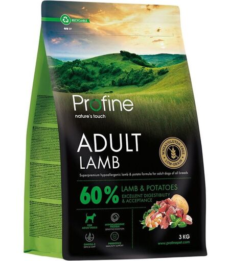 Profine Adult Lamb Profine Adult Lamb & Potatoes er et komplett fôr for voksne hunder, nøye sammensatt for å fremme helse og velvære. Med en høy andel lammekjøtt og potet som karbohydratkilde, garanterer dette fôret en optimal fordøyelse og smak. Det er også beriket med viktige næringsstoffer som støtter hud, pels, leddhelse og immunforsvar. I tillegg bidrar en blanding av prebiotika og sjøalger til en balansert tarmflora og bedre immunforsvar. Hypoallergent lammeprotein for utmerket toleranse hos hunder. Forbedrer hud og pels med reker og lakseolje. Fremmer tarmhelse og immunitet med prebiotika og sjøalger. Støtter ledd og bevegelighet med naturlige chondroprotectives og mineraler. Egner seg for voksne hunder av alle rrser. ...