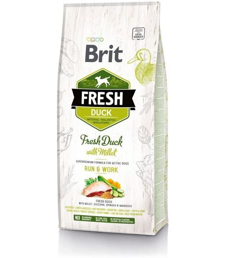 Egenskaper Detta er et holistisk superpremiumfôr for voksne, aktive hunder med fersk and, hirse, zucchini, spinat og ringblomst. Formelen er rik på naturlige kilder til aminosyrer. Foret er tilvirket av ferskt kjøtt for en svært høy smakfullhet, sunn vekst, sterkt immunforsvar, frisk hud og pels, sterke ben og muskler og friske tenner og tannkjøtt. De fleste ingredienser kommer fra lokale leverandører. Naturlige kilder. Fritt for kunstige antioksidanter, fargestoffer og smakstilsetninger. Ingen tomme kalorier eller ingredienser som ikke har noen funksjon. Rett og slett det beste naturen kan tilby! Mating Se detaljert matrasjon på forpakningen. Bruk Brit Fresh Duck with Millet Active Run & Work er tilvirket av ferskt kjøtt og er svært velsmakende. De fleste ingredienser kommer fra lokale leverandører. ...