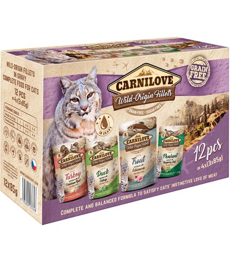Carnilove Katt Pouch Multipack 12 x 85 g bløtfôr kattCarnilove våtfôr for katter. Multipack med totalt 12 poser à 85 g/pose. Hvis du tenker på å begynne å gi katten din Carnilove, er dette en fin måte å teste ut hva du og katten din liker med Carnilove, og hvilken smak som passer katten din best! Du får 4 smaker: Rich in Turkey beriket med valerianaRich in Duck beriket med kattemynteRich in Trout beriket med EchinaceaRich in Pheasant beriket med bringebærbladerKjennetegnBalansert holistisk formel som tilfredsstiller kattens instinktive forkjærlighet for kjøtt.Garantert sammensetning uten kjemikalier, konserveringsmidler eller fargestoffer.Skogsfrukt, grønnsaker og urter som supplerer... ...