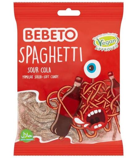 Bebeto spaghetti sour cola 70g. Spaghetti av vingummi med smak av cola. Vegansk.Ingredienser: Socker, Glukossirap, VETEmjöl, Syra: (äppelsyra), Vegetabiliskt fett: (palm), Äppeljuice från koncentrat, Surhetsreglerande medel: (citronsyra), Färgämen: (Sockerkulör). Fuktighetsbevarande medel: (Sorbitol), Emulgeringsmedel: (Mono- och diglycerider av vegetabiliska fettsyror) ...