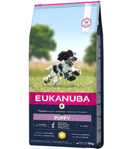 Egenskaper Eukanuba Growing Puppy Medium Breed inneholder optimale nivåer av protein, fett og karbohydrater. Fôret har en optimal sammensetning av fettsyrene omega 6 og omega 3, som fremmer tett og blank pels, frisk hud og naturlig tilheling. Eukanuba Growing Puppy Medium Breed inneholder råvarer av høy kvalitet og kun animalske proteinkilder, hovedsakelig fra kylling, i tillegg til alle viktige vitaminer og mineraler som valpen trenger for å vokse og utvikle seg på best mulig måte. Rasjonering Se detaljert rasjonering på pakken.Bruk Tørrfôr for valper av mellomstore raser ...