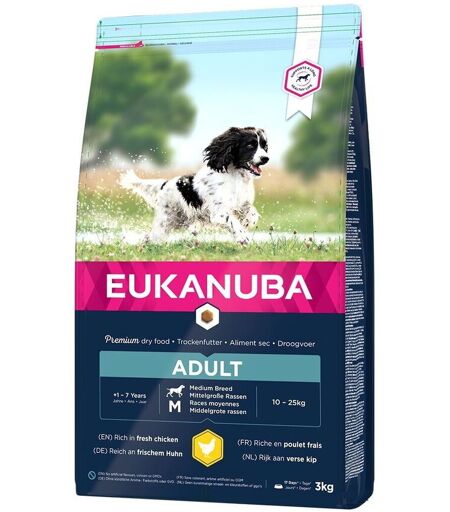 Eukanuba Dog Adult Medium Breed Eukaubas produkter inneholder den optimale mengden proteiner, fett og karbohydrater, i tillegg til viktige vitaminer og mineraler som hunden din trenger hver dag for å ha det bra. Eukanuba Dog Adult Medium Breed egner seg spesielt godt for middels store hunder (ca. 10–25 kg i kroppsvekt) fra 1 til 7 årsalder. Fôret er basert på kylling som er en svært populær proteinkilde, og beriket med blant annet omega-3 som er bra for hundens pels, i tillegg til glukosamin som fremmer sunne og sterke ledd!Velg mellom fôr på 3 og 15 kg. Trenger du en enda større pose, for eksempel hvis du er en oppdretter, kan du ta en titt på Eukanuba Dog Breeder Adult Medium Breed 18 kg! ...