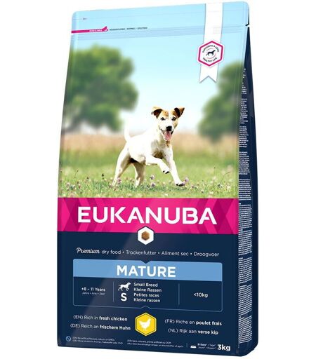 EgenskaperEukanuba Thriving Mature Small Breed inneholder optimale nivåer av protein, fett og karbohydrater samt alle viktige vitaminer og mineraler som hunden din trenger. Fôret inneholder råvarer av høy kvalitet og kun animalske proteinkilder, hovedsakelig fra kylling.Fôret inneholder kalsium som styrker skjelettet, og har et optimalt nivå av omega 3- og 6-fettsyrer som fremmer tett og blank pels, frisk hud og naturlig tilheling.RasjoneringSe detaljert rasjonering på pakken. Rasjoneringen til høyre brukes til å beregne forbruk ved abonnering på fôr. BrukTørrfôr for eldre hunder av mindre raser. ...