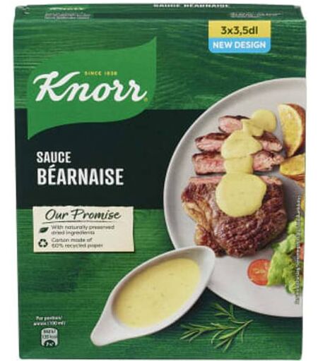 Knorr Béarnaisesaus er kongen av smaksrike sauser og er tilberedt med estragon. så den har den helt riktige smaken. Men selv om den er mest kjent for å være en ekte biffsaus. bør du også prøve den til stekt kylling eller en god kotelett.Ingredienser: Stivelse (potet- og risstivelse), vegetabilske oljer (solsikke- og majsolje), salt, Melkeprotein, hvetemel, løk¹, gjærekstrakt, melkesukker, maltodextrin, emulgator ( sojalecithin ), syre (sitronsyre), estragon 1,7%, aromaer, sukker, krydderier/krydder (bl.a. gurkemeje og persillerot¹), hvidvinsekstraktNæringsinnhold per 100 gramEnergi: 562 kjKalorier: 135 kcalFett: 11 gMettet fett: 2,6 gKarbohydrater: 6,2 gSukkerarter: 3,9 gProtein: 3,1 gSalt: 0,6 g ...