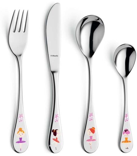Små hender er veldig forskjellige, og det kan være en utfordring å få tak i bestikk for voksne. Det ergonomisk designede bestikksettet Ballerina fra Amefa vil få barna til å føle seg tryggere ved bordet og gjøre måltidene enda morsommere. Dette moderne barnebestikksettet er av et 18/10 rustfritt stål med Ballerina-design på håndtakene. For sikkerhet til barna har de skarpe delene av kniven og gaffelen blitt gjort stumpe! Dessuten kan dette settet vaskes i oppvaskmaskin for enkelhets skyld, og det brukte kromnikkelstålet gir høy korrosjonsmotstand og en dyp speilet overflate. Bestikk fra Amefa vil fylle fantasiene ved bordet til din lille gutt med dette 4-delte bestikksettet Ballerina som leveres i en fargerik gaveeske! ...