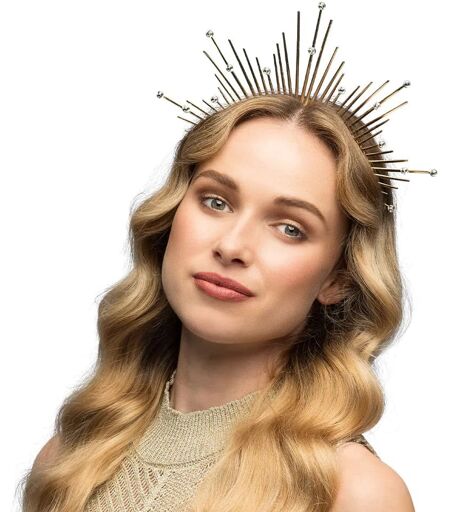 Gi antrekket ditt et himmelsk preg med Tiara Halo Orion – en elegant gullfarget tiara med strålende metallstaver og glitrende steiner. Den ikoniske halo-formen gir et uttrykk av glamour og gudinneinspirert stil, perfekt til festival, karneval, nyttårsfest eller temakostymer. Tiaranen sitter lett på hodet og passer både til oppsatt hår og løse bølger. Kombiner den med en glitrende kjole eller et kostyme med gudinne- eller engletema for å fullføre looken. ...
