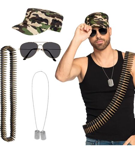 Fullfør militærlooken med dette komplette soldat tilbehørssettet i fire deler. Settet inkluderer en klassisk kamuflasjecaps, mørke pilotbriller, et identitetsmerke på kjede og et realistisk kulebelte. Perfekt som prikken over i-en til soldat- eller actionheltkostyme på karneval, temafester eller utdrikningslag. Tilbehøret er lett å kombinere med både enkle antrekk og komplette uniformer, og gir deg et tøft og helhetlig uttrykk uten mye forberedelser. ...