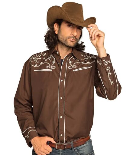 Western skjorte i brun er et must for deg som vil kle deg som en ekte cowboy. Skjorten har klassiske broderte detaljer på bryst og ermer, samt hvite kontrastsømmer som gir et autentisk westernpreg. Med sin komfortable passform og solide stoff passer skjorten perfekt til temafester, karneval eller cowboy- og westerninspirerte arrangementer. Kombiner den med jeans, cowboyhatt og boots for å få en fullendt look som gjør deg klar til fest på prærien. ...