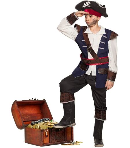 Piratkostyme Vince er et detaljert sjørøverkostyme for barn med alt som trengs for å se ut som en ekte piratkaptein. Kostymet består av en hvit skjorte med påsydd vest, svarte bukser med dekorative støvletopper, rødt midjeskjerf, skulderbelte og en klassisk pirathatt med hodeskallemotiv. Et flott kostymevalg for sjørøvertema i barnebursdag, karneval eller Halloween – komfortabelt å ha på og enkelt å bevege seg i. ...