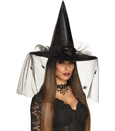 Fullfør heksekostymet ditt med denne elegante heksehatten! Heksehatt Esmeralda kombinerer klassisk hekse-look med et mystisk og stilfullt preg. Perfekt til halloween, temafester eller karneval. Hatten er i sort satengliknende stoff med høy spiss, dekorert med sort rose og gjennomsiktig slør med påsydde edderkopper. Den gir antrekket en ekstra dramatisk effekt og passer både til skremmende og glamorøse heksekostymer. ...