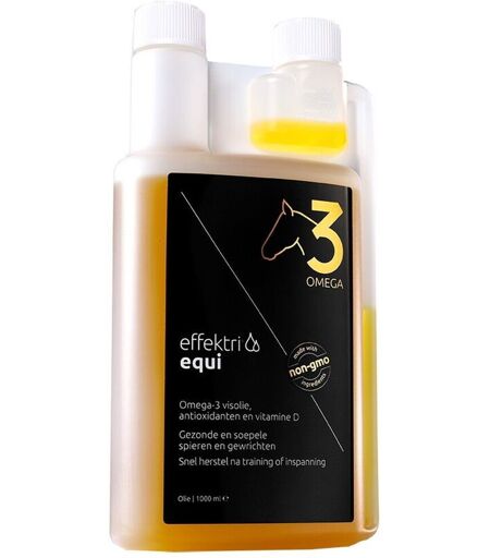 Effektri Equi Gold 1000 ml – Kosttilskudd for hester. Effektri Equi Gold er et avansert kosttilskudd for hester som kombinerer førsteklasses omega-3 med viktige næringsstoffer for ledd, som blant annet MSM, glukosamin og kondroitinsulfat. Denne unike formelen er spesielt utformet for å støtte god leddhelse, restitusjon og generell velvære hos både aktive og eldre hester. Effektri Equi Gold er perfekt for hester med høy treningsbelastning, de som er utsatt for å utvikle leddproblemer samt eldre hester som trenger ekstra støtte for god helse og vitalitet.Med en nøye utvalgt blanding av fiskeolje fra bærekraftig fiske, ekstra jomfruolivenolje med høyt innhold av polyfenol og naturlige antioksidanter, gir Effektri Equi Gold en kraftig støtte til hestens immunsystem, ledd og allmennhelse. Omega-3-fettsyrene DHA og EPA bidrar til å redusere inflammasjon, mens glukosamin og kondroitin bidrar til opprettholde sunne ledd og vev.Fordeler: Støtte for ledd og vev: Fremmer leddhelse og bevegelighet samt bidrar til gjenoppbygging av leddved. Høy absorberingsevne: Kombinasjonen av MSM, glukosamin og kondroitinsulfat forbedrer effektiviteten av omega-3-fettsyrene. Allmennhelse og velvære: Støtter hjerte, kar, hud, pels og hormonbalanse. Bruksområder: For eldre hester og ponnier: Hjelper til med å opprettholde god helse hos seniorhester ved å støtte ledd, vev og skjelett. For aktive hester: Fremmer restitusjon etter intensiv trening og beskytter mot betennelse. For hester med helseproblemer: Passer for alle hester hvor det mistenkes at betennelse er en del av sykdomsbildet. Bruk og dosering:? Anbefalt daglig dosering er 0,4 ml per kg kroppsvekt. For eksempel, en hest som veier 500 kg skal ha en daglig dosering på 200 ml. Ristes godt før bruk. Åpen flaske skal oppbevares kjølig og beskyttes mot lys, og flasken må brukes innen 4 måneder etter åpning.Ingredienser: Omega-3 (EPA og DHA) fra bærekraftig viltfanget fisk (makrell, ansjos, sardin). Ekstra jomfruolivenolje: Rik på polyfenoler. Leddstøtte: Glukosamin, MSM og kondroitinsulfat. Naturlige antioksidanter: E-vitamin og D-vitamin. ...