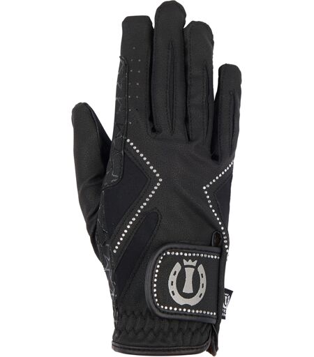 Elegant highly functional Whatever riding gloves by Imperial Riding They may look like a fashion statement but there is more to them: Thanks to the clever finish of versatile materials these gloves have an excellent fit and they guarantee a high level of wearing comfort and good grip. The inner side features a beautiful silicone-print star pattern and the outer side has sparkling rhinestones following the seam line giving the gloves a special design effect. Thanks to the touchscreen pads in the thumbs and index fingers you can use your smartphone without a problem. • Top fashionable • Anti slip • Elastic insert at the wristband • Velcro seal with Imperial Riding logo badge • Breathable... ...