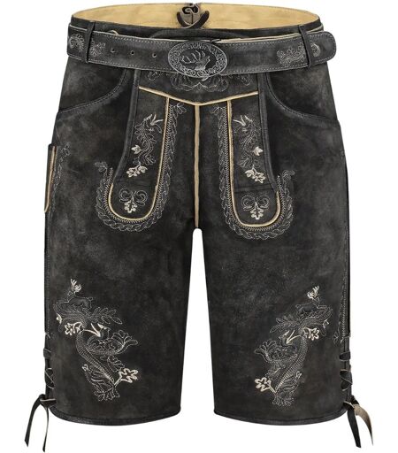 Lederhose Ludwig i antikkgrå geiteskinn er et eksklusivt valg for deg som vil ha det beste innen tradisjonelt alpetøy. Shortsen har en autentisk used-look og er rikt brodert med klassiske motiver, noe som gjør den til et ekte blikkfang på Oktoberfest eller folkefester. Bukserne har klassisk latz-design med snørelukning ved bena, flere praktiske lommer inkludert knivlomme, og medfølgende belte med kraftig metallspenne dekorert med hjortemotiv. Knapper i plast utformet som hjortehorn gir en troverdig og rustikk finish. Det myke geiteskinnet former seg etter kroppen og utvikler en vakker patina over tid, noe som gir en perfekt passform og langvarig komfort. Et luksuriøst og gjennomført produkt som kombinerer tradisjonelt håndverk med moderne stil. ...