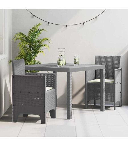 Dette moderne hagemøbelsettet bringer eleganse og funksjonalitet til en rekke uteplasser. Perfekt for terrasse- eller hagemåltider, kombinerer dette settet glatte linjer med en teksturert finish for å gi en stilig spiseopplevelse. Ideelt for sommersamlinger og al fresco middag, inviterer dette settet til bekvemmelighet og komfort, med puter for hver stol. Det firkantede bordet og matchende stoler komplementerer enkelt moderne design, og tilbyr en elegant, men avslappet setting for familiemåltider eller sosiale samlinger. Materialer: Helt laget av slitesterk polyrotting, er dette settet designet for å tåle utendørs elementer. De UV-resistente egenskapene sikrer lang levetid, noe som gjør det til et utmerket valg for sommerspising. Inkluderte komponenter: Dette hagemøbelsettet inkluderer et bord og fire stoler. Stolene har armlener og en støttende ryggstøtte, som øker komforten for langvarig sitting. Pute med skumfyll gir ekstra kos. Egenskaper / Funksjon / Design: En solid og stabil konstruksjon lar settet tåle regelmessig bruk i utendørs rom. Den minimalistiske designen komplementerer ulike estetiske preferanser. Anbefalte bruksområder: Ideelt for uteplasser, hager eller terrasser, og tilbyr et raffinert område for måltider, sosialisering eller bare avslapning med familie og venner. Vedlikehold og rengjøring: Tørk av overflatene med en fuktig klut og unngå direkte sollys for å bevare utseendet. Ta putene innendørs ved dårlig vær og dekk til møblene når de ikke er i bruk. ...