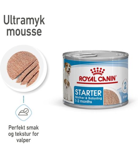 EgenskaperRoyal Canin Wet Dog Starter Mousse er et våtfôr som er spesialutviklet for å hjelpe valpen under overgangen fra tispens melk til fast føde. Egner seg også svært godt til å dekke tispens behov under drektighet og diegiving.RasjoneringSe detaljert rasjonering på pakken. Rasjoneringen til høyre brukes til å beregne forbruk ved abonnering på fôr BrukVåtfôr for valper opptil 2 måneder samt drektige og diegivende tisper. ...