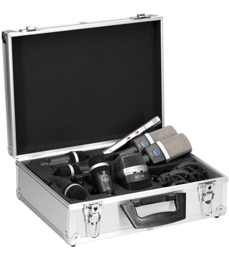 Håndvalgte mikrofoner som gir deg trommelyd i verdensklasse. AKGs premium mikrofonpakke for trommesett er det ultimate valget for å spille inn trommer på scener og i studioer. Pakken gir deg alt du trenger for å montere mikrofoner på et fullt trommesett inkludert støtmonteringer stativadaptere og klemmer som kan festes på trommeringer. Pakken består av fire D40 instrumentmikrofoner en D12 VR basstrommemikrofon en C451 B kondensatormikrofon og et matchende par C214 kondensatormikrofoner. Hele settet leveres i en robust metallkoffert slik at du kan oppbevare og transportere mikrofonene på en trygg måte. Dette allsidige opptaksutstyret gjør det enkelt å spille in kraftfulle naturlige trommeopptak. ...