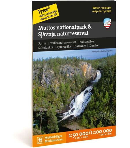 Vandrekart over Muddus nasjonalpark og Sjaunja. Laget av materialet Tyvek som er sterkt og vanntett. Kartet over nasjonalparken er i skala 1: 50 000, mens baksiden som viser et større område er i 1: 100 000. Skala: 1: 50 000 og 1: 100 000Materiale: Tyvek ...