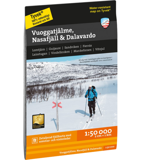 Vuoggatjålme - Nasafjäll - Dalavardo 1:50 000 fra Calazo forlag er et fjellkart med terrenginformasjon basert på flybåren laserskanning. Det er også det første fjellkartet noensinne over dette området i skala 1:50 000. Foruten helt nye høydelinjer med ekvidistanse 10 meter, fremtrer blant annet vannløp og skråninger på en betydelig bedre måte enn tidligere. Stiene gjengis med større nøyaktighet, likt som myr, bygninger, steinbundet mark og vanskelig fremkommelig vegetasjon. Dette gjør den perfekt å ha med når du gjør kortere turer som kanskje krever mer informasjon om terrengen, for eksempel hvis du gjør toppturer eller fisker. Calazo forlag har kommet frem til at det beste materialet for et kart er Tyvek®. Det er laget av en syntetisk fiber som gjør kartet helt ufølsomt for vann og meget rivsterkt. Et Tyvekkart går ikke i stykker i brettene eller mister fargen når du bruker det. ...