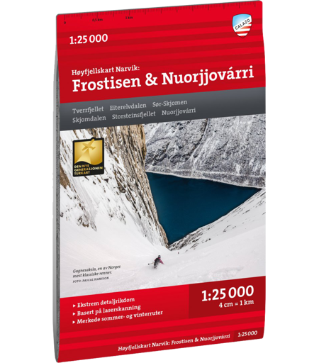 Høyfjellskart Narvik: Frostisen & Nuorjjovárri 1:25.000 fra Calazo förlag er et av tre unike kart med en detaljrikdom som aldri tidligere er vist over fjellområdene rundt Narvik. Terrenginformasjonen i kartet er basert på laserskanning fra fly. Fjellskrenter, vassdrag, breer og andre naturelementer vises mye mer detaljert med denne teknologien. Kartet inneholder også flere stier enn noe kart tidligere over samme område. Et kart i målestokk 1:25 000 er nyttig for deg som planlegger en topptur til Nuorjjovárri (1660 moh) eller Frostisen (1724 moh). Kartet vil også kunne brukes av de som ønsker å forlate merkede stier for å utforske egne ruter i høyfjellet. ...