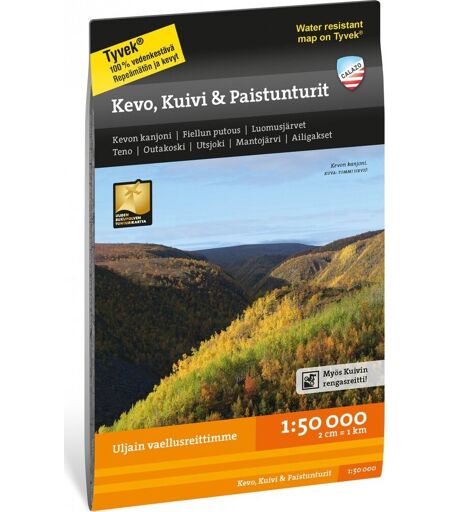 Kevo, Kuivi & Paistunturit 1:50000 er et kart fra Calazo forlag. Kevo-kløften er en storslått naturopplevelse. Den oppleves ved å vandre den 63 kilometer lange vandringsleden, som går langs og på kanten av ravinen. På naturvernområdets ravineområde er det tillatt å gå på ski 16.10 - 31.3 og vandre 15.6 - 15.10 på merkede stier. På fjellområdet er det tillatt å gå på ski 16.10 - 30.4 og vandre 1.5 - 15.10 på merkede stier. Fra Sulaoja kan du vandre til Kuivi året rundt, men den 86 kilometer lange rundløypa som går gjennom ravineområdet er tilgjengelig kun fra og med 15.6. Kartet er trykket på høykvalitets Tyvek®-materiale, som er vanntett og rivebestandig. Dermed trenger du ikke å beskytte kartet ditt mot regn, og det går ikke i stykker ved bruk. Produsenten garanterer at materialet tåler 20 000 foldinger. Takket være den smarte bladinndelingen, får alle områdets viktigste turmål plass på ett eneste kart. ...
