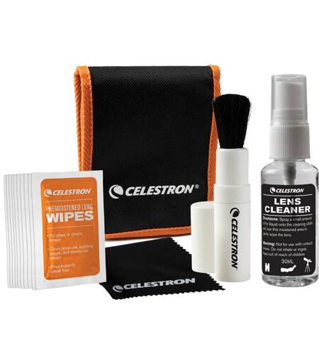 Celestron rensesettKomplett rensesett bestående av 10 stk. våtservietter, mikrofiberklut, linsebørste, og rensevæske på sprayflaske. Leveres med en praktisk nylonveske med borelås. ...