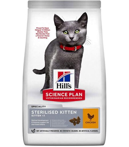 Hill's Science Plan Kitten Sterilised Chicken Tørrfôr for kastrerte kattunger. Med kontrollert fettinnhold og proteiner av høy kvalitet! Hill's Science Plan Kitten Sterilised Chicken er et velkomponert kattefôr med særlig omtanke for unge katter! Fôret inneholder kvalitetsråvarer og er godt balansert. På den måten får din kastrerte kattunge i seg riktig mengde kvalitetsnæring for å vokse seg sunn og sterk, uten å risikere å gå opp i vekt! Kastrerte katter risikerer å gå opp i vekt som følge av endringer i kroppens hormonprosesser etter kastreringen. Metabolismen blir mindre aktiv, noe som igjen påvirker kroppens forbrenning. Kastrerte katter får dessuten bedre appetitt, derfor er det ekstra viktig å bruke et velbalansert fôr med mindre fett slik at katten kan spise seg mett uten å risikere å legge på seg uønskede kilo! Dette fôret baserer seg på kylling og kalkun, to proteiner som er enkle for katten å absorbere. Dessuten smaker de godt og bidrar til god smak under hvert måltid! Server Hill's Science Plan Kitten Sterilised Chicken sammen med fri tilgang til friskt vann, slik at katten stimuleres til å drikke nok. Vel bekomme! Kattefôr for kastrerte kattunger Med kylling og kalkun Kontrollert fettnivå Proteiner av høy kvalitet Velbalansert for at katten skal vokse seg sunn og sterk Meget velsmakende ...