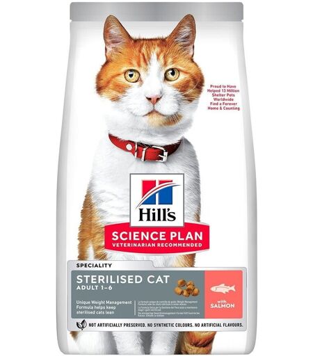 Hill's Science Plan Feline Adult Sterilised Salmon Hill's Science Plan Feline Adult Sterilised Salmon tørrfôr med laks er et førsteklasses fôr for voksne steriliserte katter. Fôret har en unik sammensetning for bedre vektkontroll, som hjelper til med å forbrenne fett, bygge muskler og holde kastrerte katter slanke. Det er laget av førsteklasses, lettfordøyelige ingredienser som sikrer optimal næring og fordøyelse. Fôret anbefales for voksne kastrerte katter over 1 års alder, men bør ikke gis til kattunger eller drektige/diegivende katter. Unik sammensetning for vektkontroll som hjelper til med å forbrenne fett og bygge muskler. Laget av førsteklasses, lettfordøyelige ingredienser. Hjelper til med å holde kastrerte katter slanke og sunne. Anbefales for voksne kastrerte katter over 1 år. ...