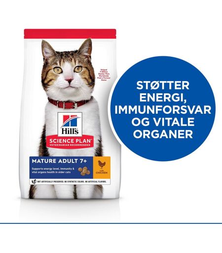 Hill's Science Plan Cat Mature Adult 7+ Chicken Hill's Science Plan Cat Mature Adult 7+ Chicken er et komplett fullfôr som passer for eldre katter fra ca. 7 år. Fôret er lettfordøyelig og har en deilig smak av kylling! Dette fôret er utviklet for å gi den eldre katten din et så godt liv som mulig på tampen av livsløpet. Fôret er snilt mot magen, inneholder naturfiber og er basert på kylling, som er en veldig populær proteinkilde. Fôret inneholder Omega-3, Omega-6 og vitamin E, som støtter kattens hud og pels, og selvfølgelig også taurin som er bra for blant annet hjertet og synet. Hill's Science Plan Cat Mature Adult 7+ Chicken inneholder velbalanserte mineraler som er bra for både urinblæren og nyrene – spesielt viktig for eldre katter. ...