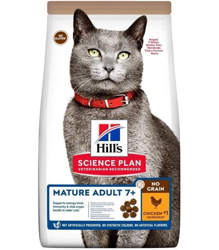 Hill's Science Plan Cat Mature No Grain med Kylling 1,5 kg Når man har en eldre pus hjemme er det viktig å satse på et fôr som er laget med tanke på nettopp en senior katt. Eldre katter har ofte lavere energibehov samtidig som de kan trenge litt hjelp med leddene og pelsen sin. Hill's Science Plan Cat Mature No Grain med Kylling inneholder både Omega-3 og Omega-6, som både bidrar til sunne ledd og fremmer fin og blank pels.. Fôret anbefales først og fremst til katter over 7 år. Det er helt fritt for kornprodukter og har kyllingsmak, noe de fleste katter liker! ...