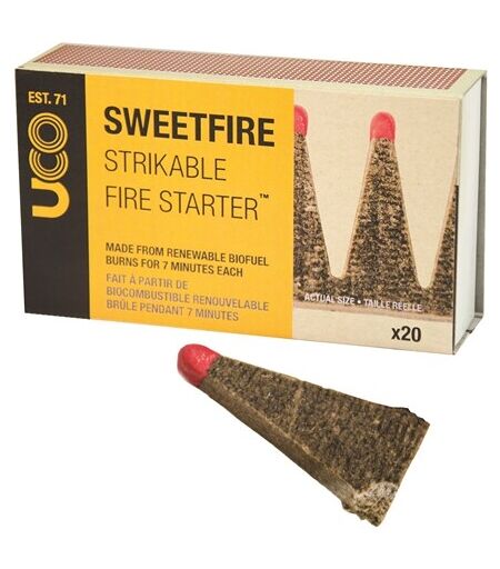 Med Sweetfire Strikable Fire Starter får du garantert fyr på bålet. Den fungerer som en fyrstikk ved at du stryker kjapt på friksjonsflaten for å antenne, men forskjellen er at den brenner i opptil syv minutter. Derfor fungerer den også som en opptenningsbrikett. Fyrstikkene er svært miljøvennlige. D ...