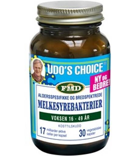 Udo`s Choice Melkesyrebakterier for fordøyelsen og en sunn tarm. Kraftig og bredspektrede melkesyrebakterier tilpasset alle aldersgrupper. Forebygger fordøyelsesproblemer, bedrer opptaket av næringsstoffer og er gunstig for immunforsvaret. Ingredienser:Fyllemiddel (mikrokrystallinsk cellulose), fortykningsmiddel (hydroksypropylmetylcellulose), aktive probiotiske celler (se innhold per anbefalt døgndose), antiklumpemiddel (magnesiumsalter av fettsyrer), antioksidant (askorbinsyre)Innhold pr. døgndose (17 milliarder aktive celler pr. kapsel). Lactobacillus Casei HA-108 35 %Lactobacillus rhamnosus HA-111 25 %Lactobacillus acidophilus HA-122 20 %Lactobacillus plantarum HA-119 10 %Bifidobacterium bifidum HA-132 5 %Bifidobacterium breve HA-129 5 %Dette produktet er et kosttilskudd og skal ikke erstatte et variert kosthold. Daglig inntak bør ikke overskride anbefalt dosering. Oppbevares utilgjengelig for barn. Dosering:1 - 2 kapsler daglig, inntas rett etter måltid. Egnet for vegetarianere. Ikke tilsatt gluten eller laktose. Innhold:30 vegetabilske kapsler ...