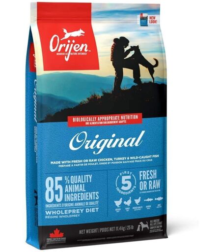 EgenskaperOrijen Adult Dog är ett spannmålsfritt foder med rikt innehåll av frigående kyckling och kalkon, hela ägg och vildfångad söt och saltvatten fisk. Alla ingredienser är färska med oöverträffad näring och smak, och de har aldrig varit frysta och innehåller inget konserveringsmedel.UtfordringSe detaljerad fodergiva på förpackningen. Fodergiva till höger används för att beräkna förbrukning vid foderprenumeration. AnvändningTorrfoder för vuxna hundar ...