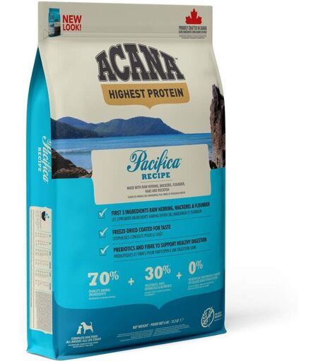 Acana Pacifica Dog Acana Pacifica Dog inneholder rikelig med sild, sardiner og flyndre som aldri har vært fryst, og inneholder ingen konserveringsmidler. Store mengder omega 3 fremmer en sunn hud og pels. Fôret er kornfritt og inneholder dessuten frukt, grønnsaker og urter – inkludert gresskar, tang og lavendel som øker stoffskiftet og hjelper med fordøyelsen. Rasjonering Se detaljert rasjonering på pakken. Rasjoneringen til høyre brukes til å beregne forbruk ved abonnering på fôr. Bruk Tørrfôr for voksne hunder ...