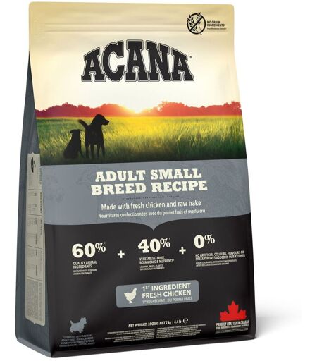 Egenskaper Acana Adult Small Breed er spekket med frittgående kylling, villfanget flyndre og hele egg som leveres ferske så de er fulle av av næring og smak. Rik på kjøttproteiner som bidrar til at hunden får best mulig helse og kondisjon. Samtidig ekskluderer Acana korn og enkle karbohydrater som ris, tapioka og potet. Fôret har et kjøttinnhold på 60 % og er inneholder ingen planteproteinekstrakter. Adult small breed inneholder blant annet kjøtt fra frittgående kylling (kjøtt, lever, hjerte, nyre og brusk), egg (hele og ferske) samt villfanget flyndre (hel og fersk fra nordre Vancouverøya) Rasjonering Se detaljert rasjonering på pakken. Rasjoneringen til høyre brukes til å beregne forbruk ved abonnering på fôr. Bruk Tørrfôr for voksne hunder av små raser ...