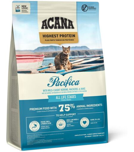 Kornfritt tørrfôr for alle katter: Acana Cat Pacifica Acana Cat Pacifica er et kornfritt tørrfôr for katter som inneholder 75 % frittfanget fisk. Dette komplette fôret inneholder naturlig balansert kjøtt, innvoller og smakrike bruskbiter, som gir katten din næring for en optimal helse. 75 % frittfanget sild, makrell, kolje, hvitting, flyndre og rødspette. Støtter immunsystemet og fordøyelsessystemet med antioksidanter, vitaminer, mineraler. Bra for hjerte og øyehelse, Inneholder taurin, EPA- og DHA-omega-3-fettsyrer. Passer for katter i alle aldre og størrelser ...