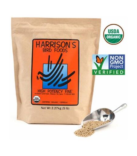 HARRISON'S HIGH POTENCY FINE, 5 ELLER 1 PUNDMaximum Nutritional Formula for Small to Medium BirdsLageret er i Kristiansad for de som vil hente på Kristiansand Smådyrklinikk, Lauvåsen.Year-round formula for conures, lories, quakers, cockatiels, lovebirds, doves and other small to medium parrots.Conversion: All birds should start out and remain on High Potency Formula for a period of at least 6 months.Special needs: For birds that are molting, overweight, underweight, particularly active, housed in a cold climate, recovering from an illness or affected by liver or kidney disease. Please visit harrisonsbirdfoods.com/specialneedsWeaning Birds: Feed High Potency Formula for at least 6-9 months.Breeding Birds: Birds should be fed High Potency Formula 1-2 months prior to the breeding period and until chicks are weaned or for at least six months before resuming Adult Lifetime Formula. The amount of supplemental certified organic vegetables and fruits may be increased until the chicks are weaned. For each 2 Tbs (20 g) Formula, add ½ (5 g) Tbs certified organic sunflower seeds.Storage: Harrison's Bird Foods do not contain artificial preservatives. Once opened, a bag of Harrison's should be used up within 6 weeks. Storing food in fridge or freezer helps maintain freshness. Note "use before dating" on bag. ...