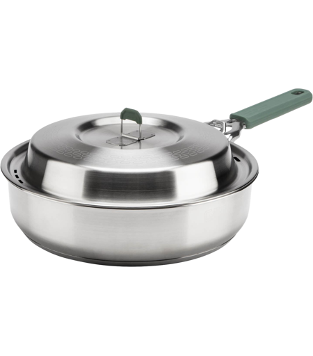 ComplEAT Sauté Pan fra Gerber er en traktørpanne for matlaging utendørs. Den rommer 2,5 liter og har en generøs stekeflate, lokk med dampfunksjon og et avtagbart håndtak. Perfekt for seriøse leirkokker som ønsker ytelse i et kompakt format. Denne solide traktørpannen i rustfritt stål er et must for alle som elsker å lage mat i naturen. Den holdbare konstruksjonen med 3-lags bunn gir en jevn varmefordeling. Lokkets design bevarer fukt og smak, samtidig som det har praktiske hull for å helle av vann. Det avtagbare håndtaket gjør pannen enkel å pakke. Perfekt for camping, vandring og andre eventyr hvor du vil lage god mat. Romslig stekeflate Lokk med dampfunksjon og hellehull Avtagbart håndtak med silikonhåndtak 3-lags bunn for jevn varmefordeling Tåler oppvaskmaskin Korrosjonsbestandig ...
