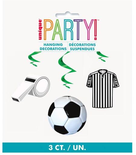 Stilige hengedekorasjoner med fotballmotiv. 3 ulike med en lengde på 66cm Perfekt til å henge over bordet på bursdagsfesten. Se relaterte produkter under for andre produkter til fotballfesten. ...