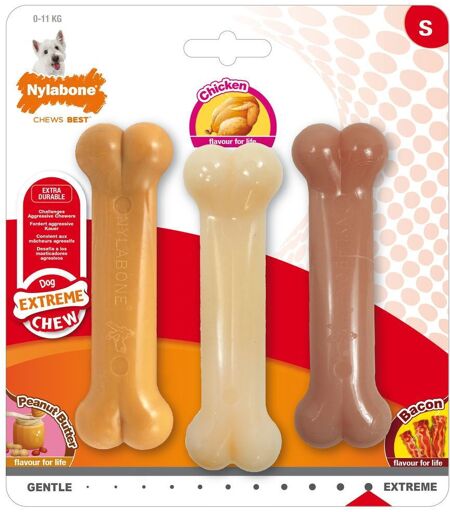 Tyggebein for hunder som tygger på skor Nylabone har laget tyggebein for hunder som har en tendens til å tygge på sko og møbler. Beina deres tåler intensiv tygging og gnaging og er også smaksatt. Denne multipakken inneholder tre bein med forskjellige smaker. peanøtt kylling bacon Når hunden din tygger på beina, dannes det børstelignende biter som masserer hundens tenner og tannkjøtt, som motvirker både plakk og tannstein. Tyggebeina passer for små hunder mellom 1–11 kg. Husk at du alltid må følge med på hunden/katten når den leker med leker, og kast leken hvis den går i stykker.?Tyggebein fremmer en god tannhelse og et friskt tannkjøtt. Det er i tillegg en utmerket sysselsetting for hunden din. Husk at du alltid må ha hunden din under oppsikt når den tygger på bein, og sørg for at den alltid har tilgang til vann. ...
