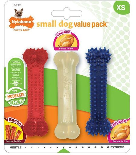 EgenskaperNylabone Multipack er perfekt for å tilfredsstille hundens naturlige behov for å tygge og gnave. Lekene er laget av slags materiale som ikke frigjør store stykker. Lekene er smaksatt gjennom og vil fortsette å være interessant for hunden din, selv når de begynner å bli slitt. Passer for små hunder som veier opptil 7 kg. Perfekt for eldre hunder som ikke tygger så intenst. Pakken inkluderer en fleksibel chew kylling smak, en dental tygge bacon smak og en dental tygge kylling smak. Husk å alltid holde et øye med hunden din når du bruker leketøyet.BrukFlavored tygge leker for hunder.Tyggeben fremmer god tannhelse og et sunt tannkjøtt, samtidig som det er en morsom aktivitet for hunden. Husk å holde et øye med hunden din når den tygger og pass på at den alltid trenger å ha vann tilgjengelig. Husk at godteri aldri er et alternativ til et balansert kosthold - det skal alltid gis ved siden av som en bonus eller belønning. Uansett hvor glad din firbente venn er i godteri, så er det du som eier som er ansvarlig for at dyret holder seg frisk og rask. Les anbefalingene på emballasjen og husk at alle dyr er individer - juster inntaket etter hva som passer for akkurat din venn! ...