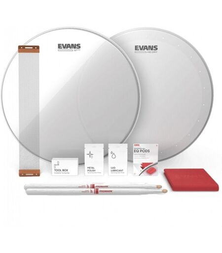Evans TuneUp Kit HD Dry Snare er det ultimate tuningsettet for din dyrebare snare. HD-tørrrørehodet er best egnet for rock- og metalltrommeslaging takket være dets presisjonsborede ventiler langs omkretsen av huden som reduserer de uønskede overtonene betydelig og kontrollerer snare naturlige sustain. I tillegg består det medfølgende klare resonanstrommehodet av et enkelt lag for å kontrollere snare responsen på alle dynamiske nivåer for å legge til allsidighet til hverdagens trommespill. Alt er inkludert fra en trommenøkkel metallpolering og lugg-smøremiddel til EQ-pods en poleringsklut og til og med et par slitesterke Promark-pinner for å få den aller beste lyden og glansen fra snare din. Laget i USA oppfyller Evans TuneUp Kit HD Dry Snare ekstremt høye kvalitetsstandarder for å gi deg trygghet mens du legger ned rillene. Vennligst merk: Skarptromme ikke inkludert. ...
