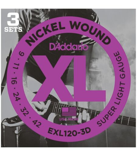 D'Addario EXL120 Nickel Wound Super Light 9-42 x 3 Pack er et av D'Addarios bestselgende strengesett på grunn av sin fleksibilitet og bitende tone. Disse strengene er viklet med nikkelbelagt stål på en nøye trukket sekskantet formet kjerne av høykarbonstål. Takket være dette har disse strengene styrken og holdbarheten til å vare forestillinger som kommer samtidig som de leverer en tone som er særegen lys og fullpakket med utmerket intonasjon. Hver av dens utrolige kvaliteter sikrer at denne tre-pakken med strenger kan romme en rekke gitarmodeller sjangre stiler og teknikker. Hvert av de inkluderte settene har blitt plassert i miljøvennlig emballasje for å sikre at strengene dine ikke korroderer og bevarer den rene og skarpe tonen. D'Addario strenger det perfekte tilbehøret for gitarister. ...